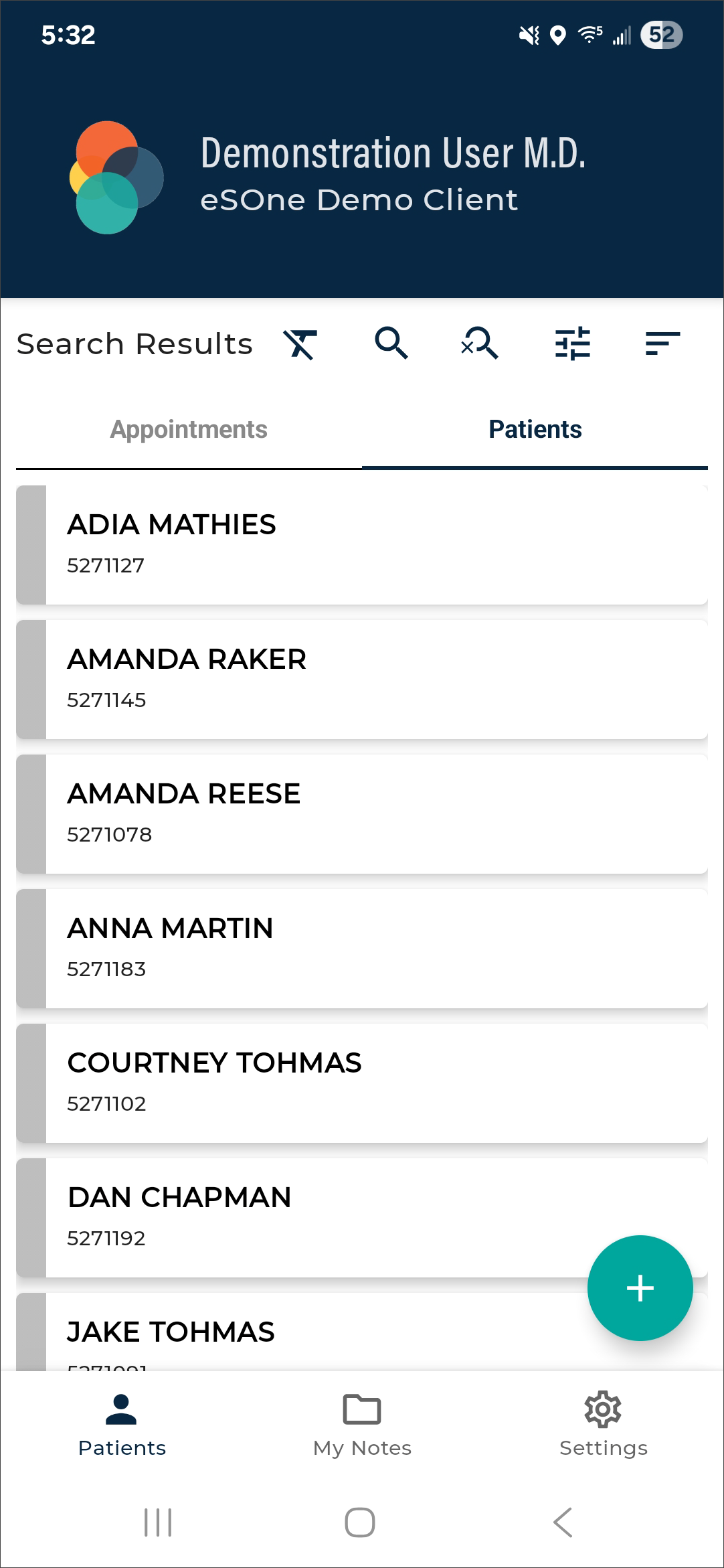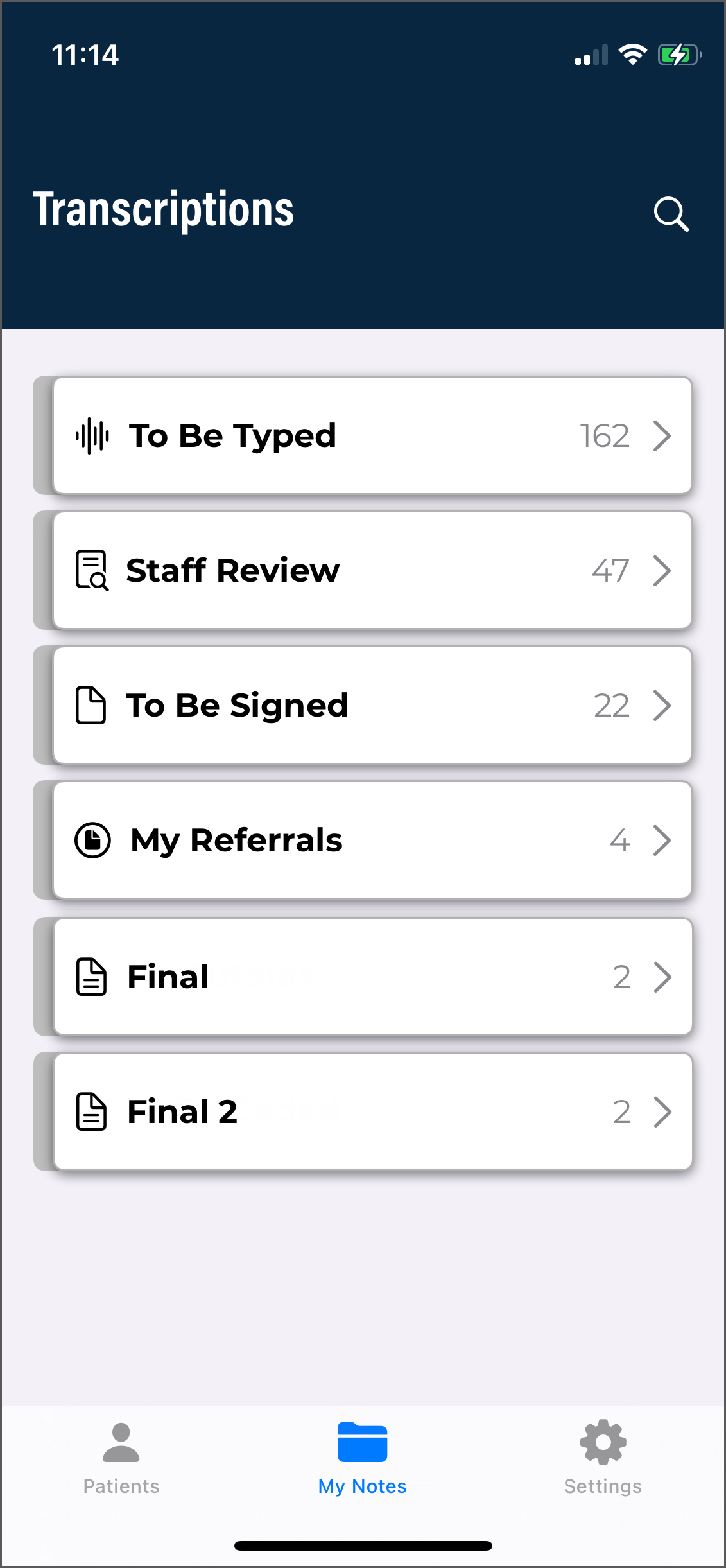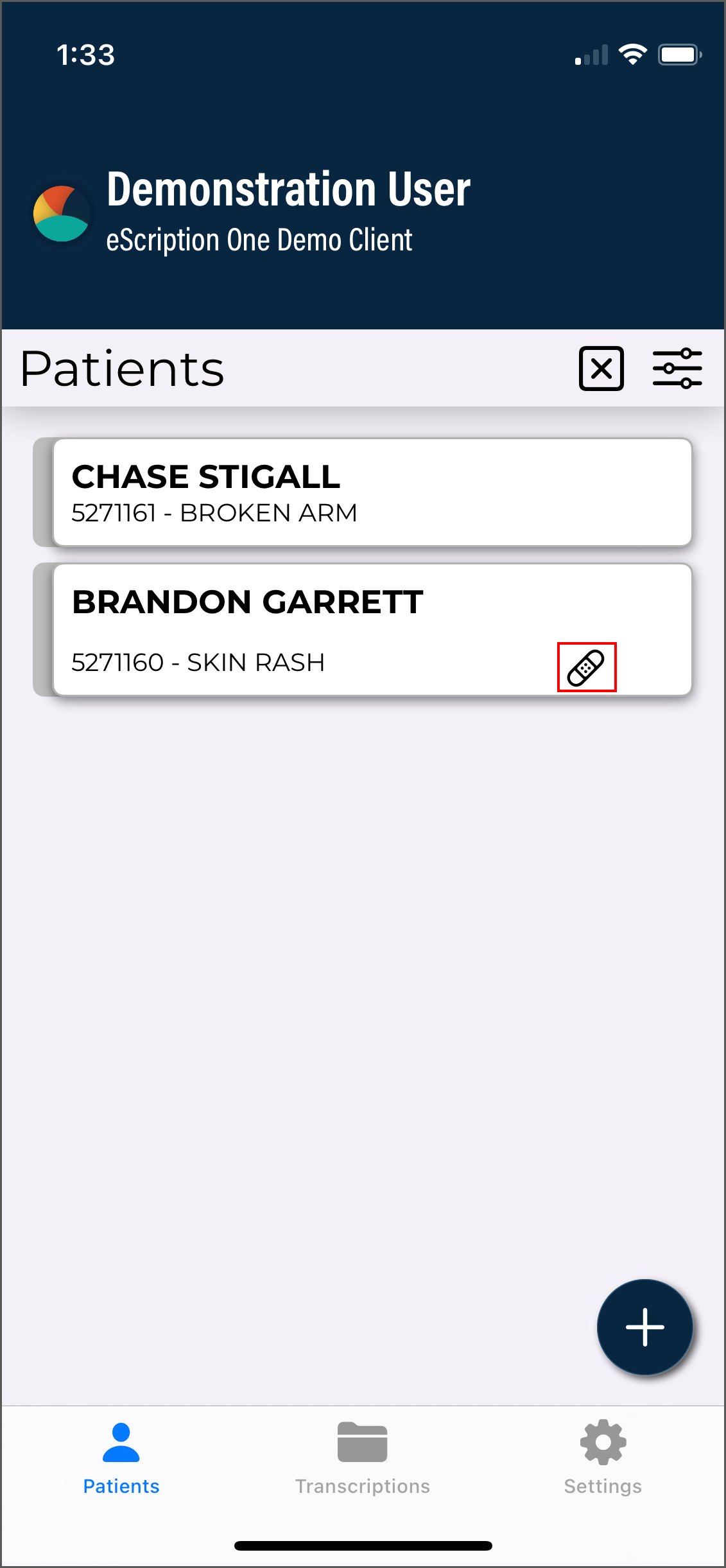 The eSOne Mobile application screens have three tabs at the bottom: Patients, Transcriptions, and Settings. Use these to navigate between the main screens of the app. The active tab is indicated with bold text and black-filled icons. The eSOne Mobile application displays the Patients tab after your initial login, or the last screen you visited in your previous session.