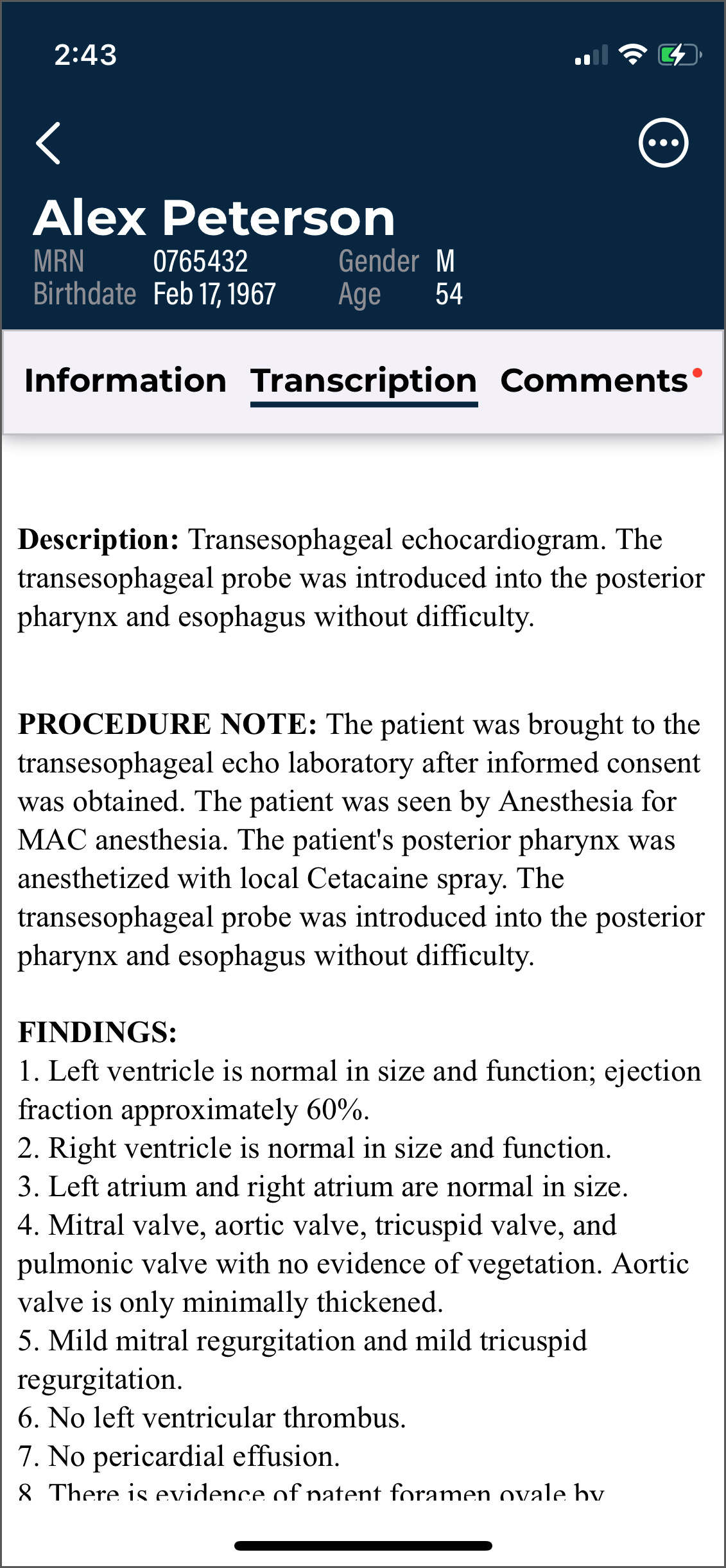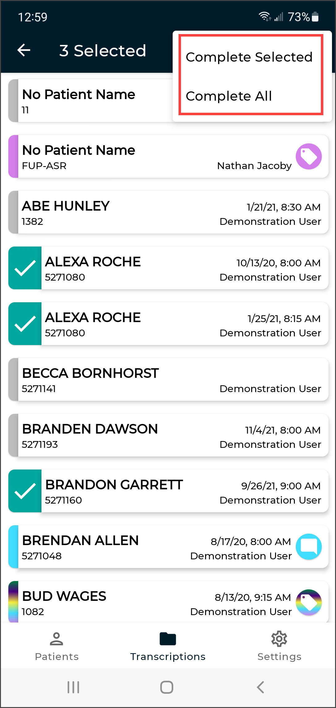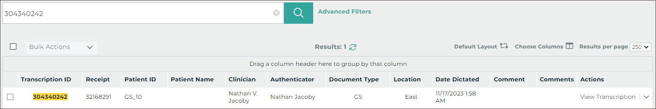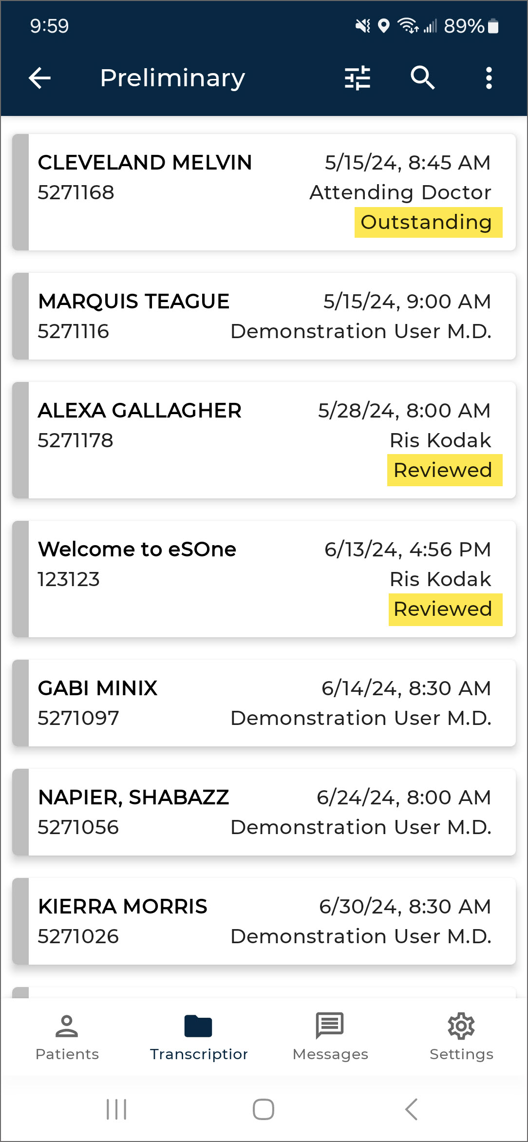 The Transcriptions tab opens the Transcriptions screen, where users can view, approve/sign, and edit transcriptions.