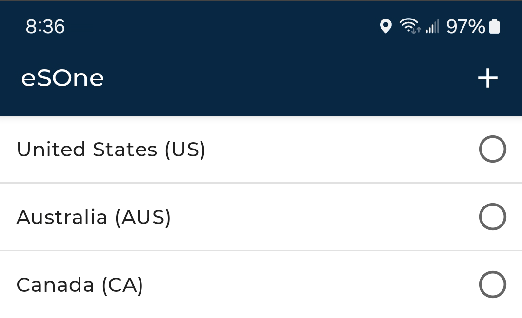 When the eSOne Mobile app is launched for the first time users will be prompted to select a region. This allows the app to connect to the proper servers. Choose the region that applies to the client and tap Select.