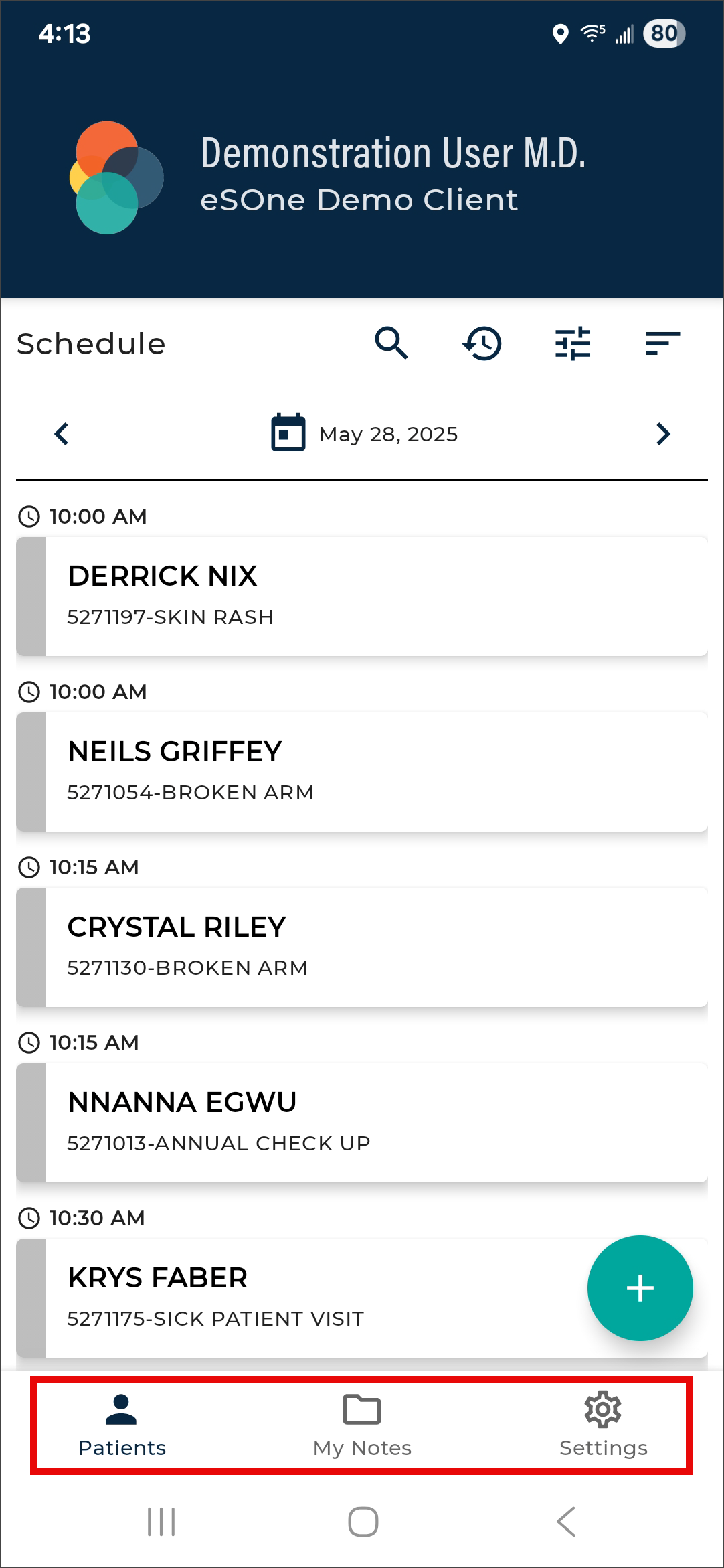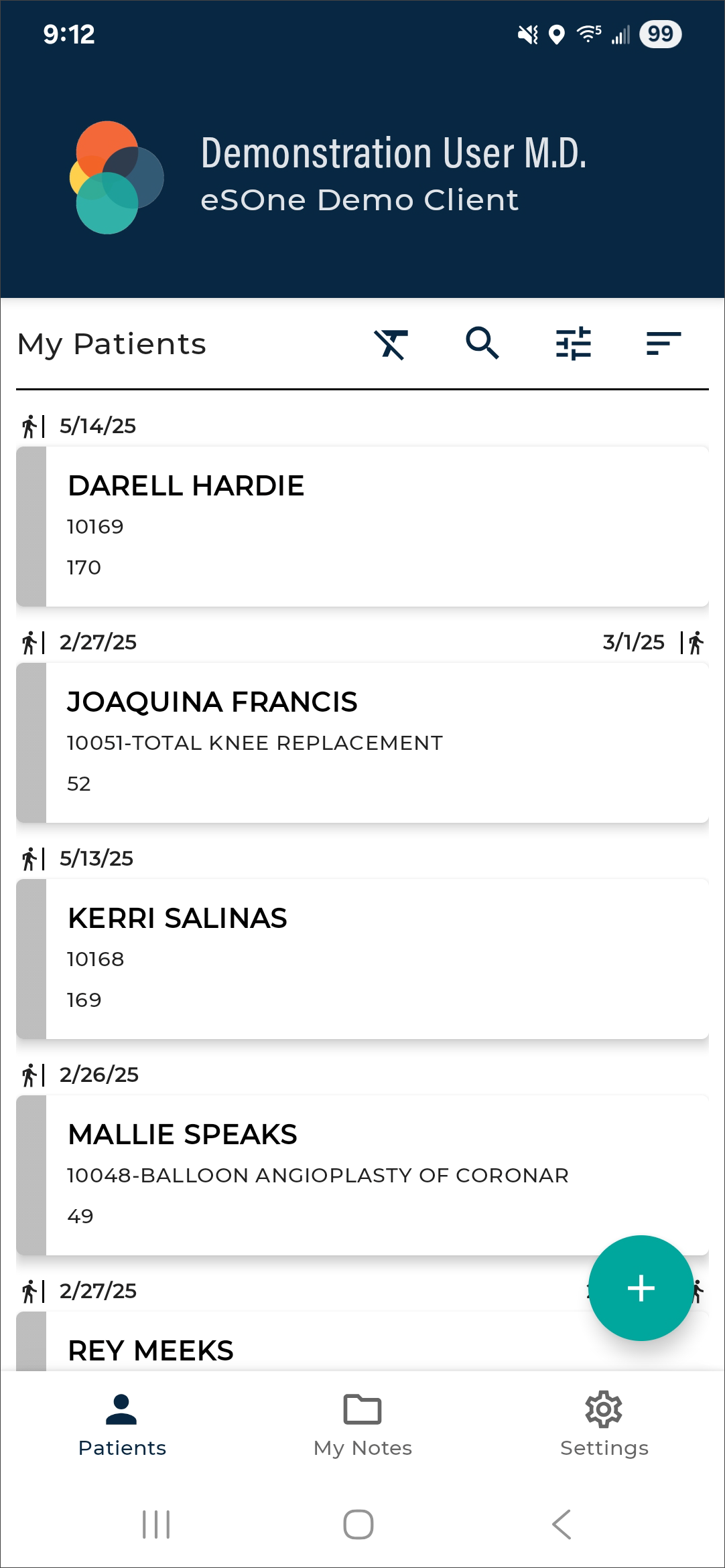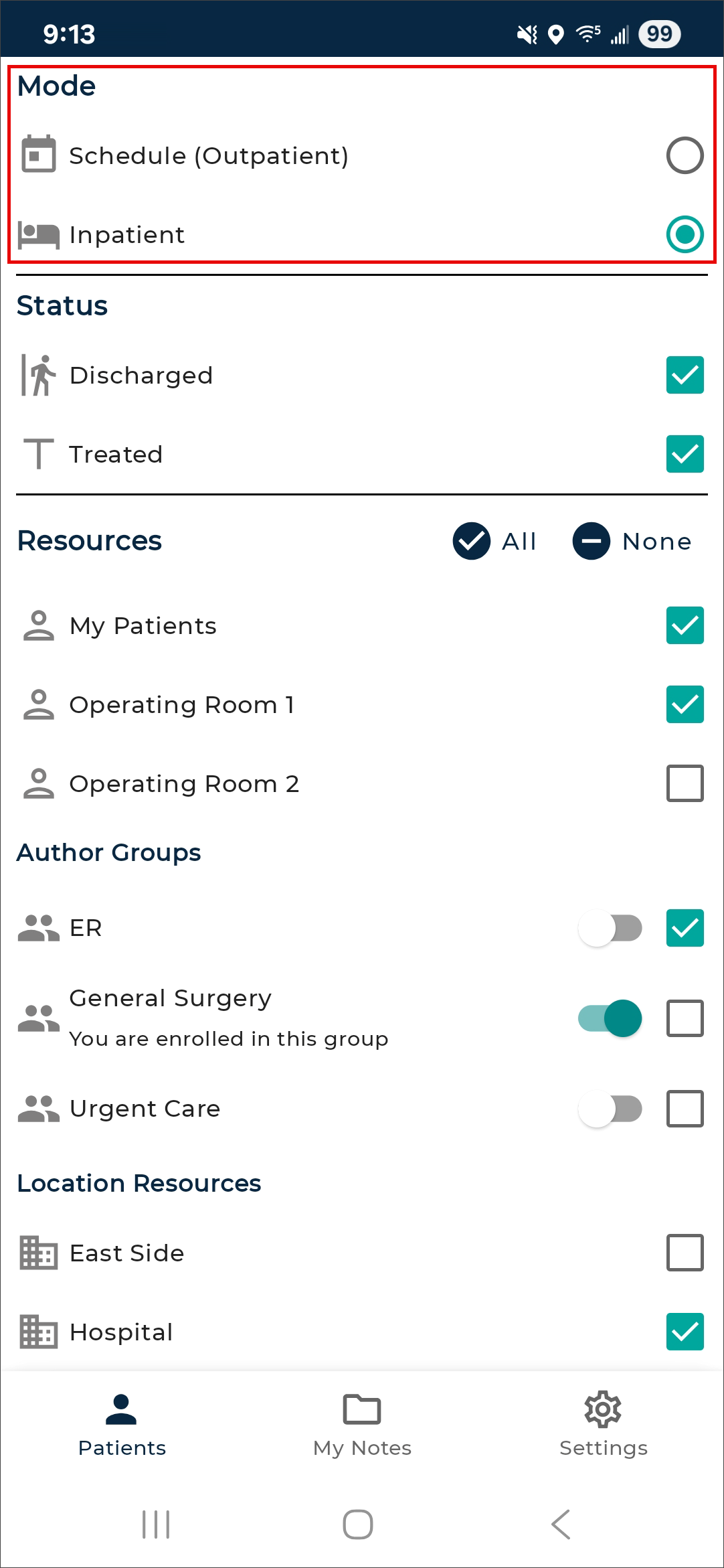 The eSOne mobile app supports outpatient and inpatient schedules. By default, the app opens to schedule (outpatient) mode. The mode can be changed in Filters the schedule filters. This section of the user guide will focus on the outpatient schedule mode. See Inpatient Workflow for more information about inpatient mode.