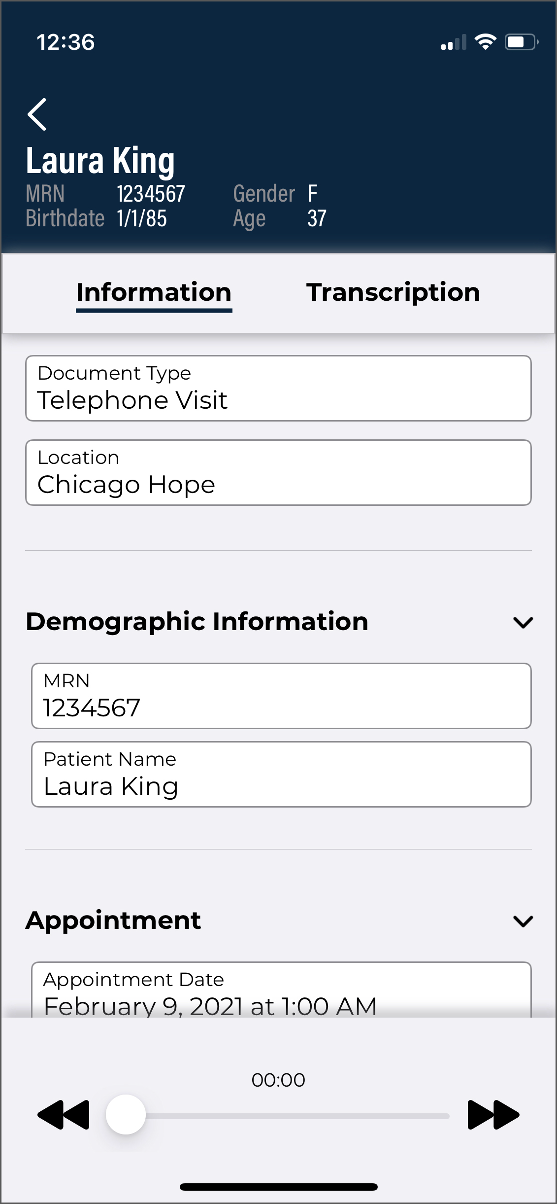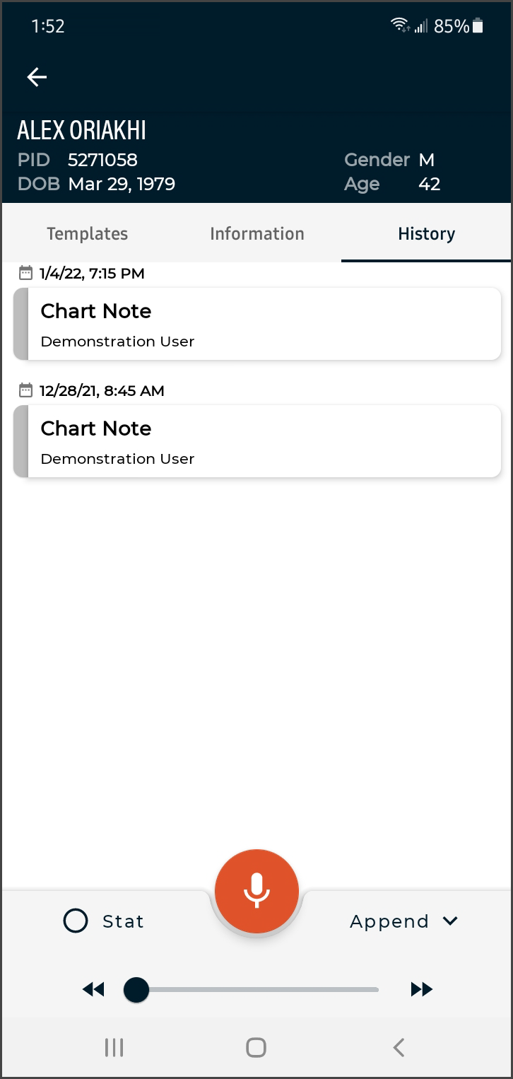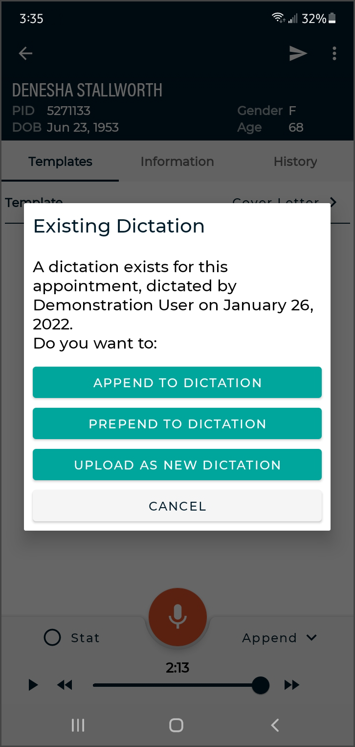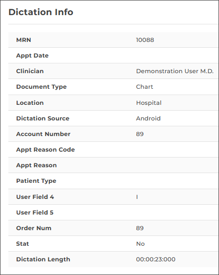 Dictation from another source - appointments with a dictation uploaded from a different mobile device or dictation source (InSync, InTouch, ShadowLink, etc.), or uploaded from this device but no longer stored on this device. Dictations uploaded from other devices or apps cannot be played from this device.