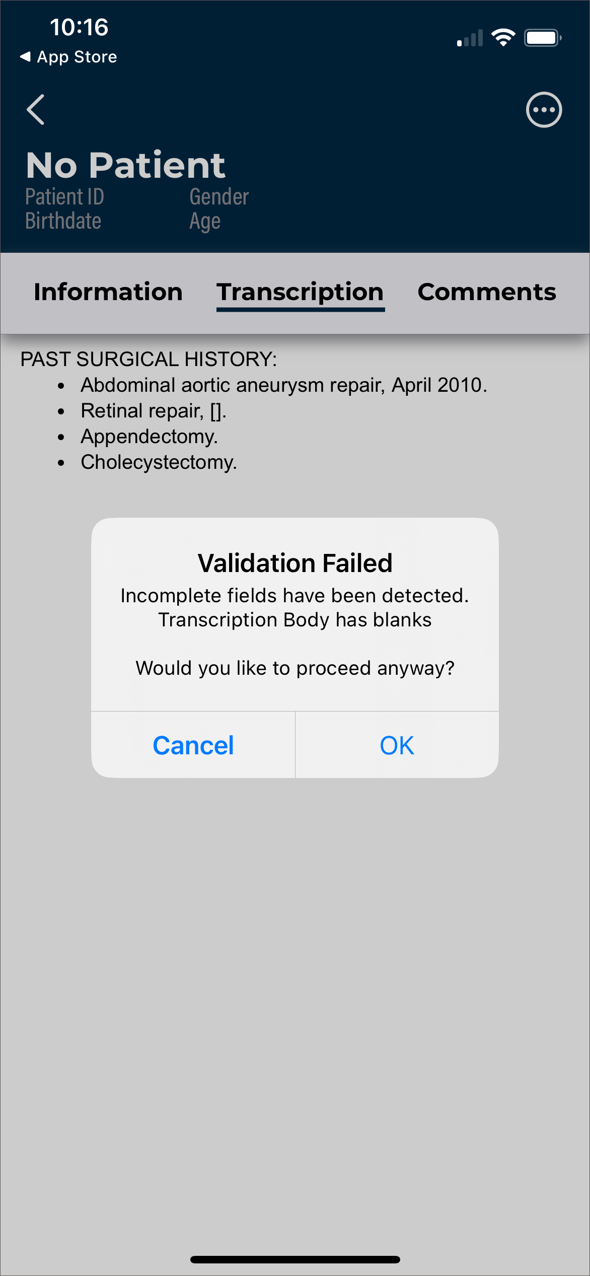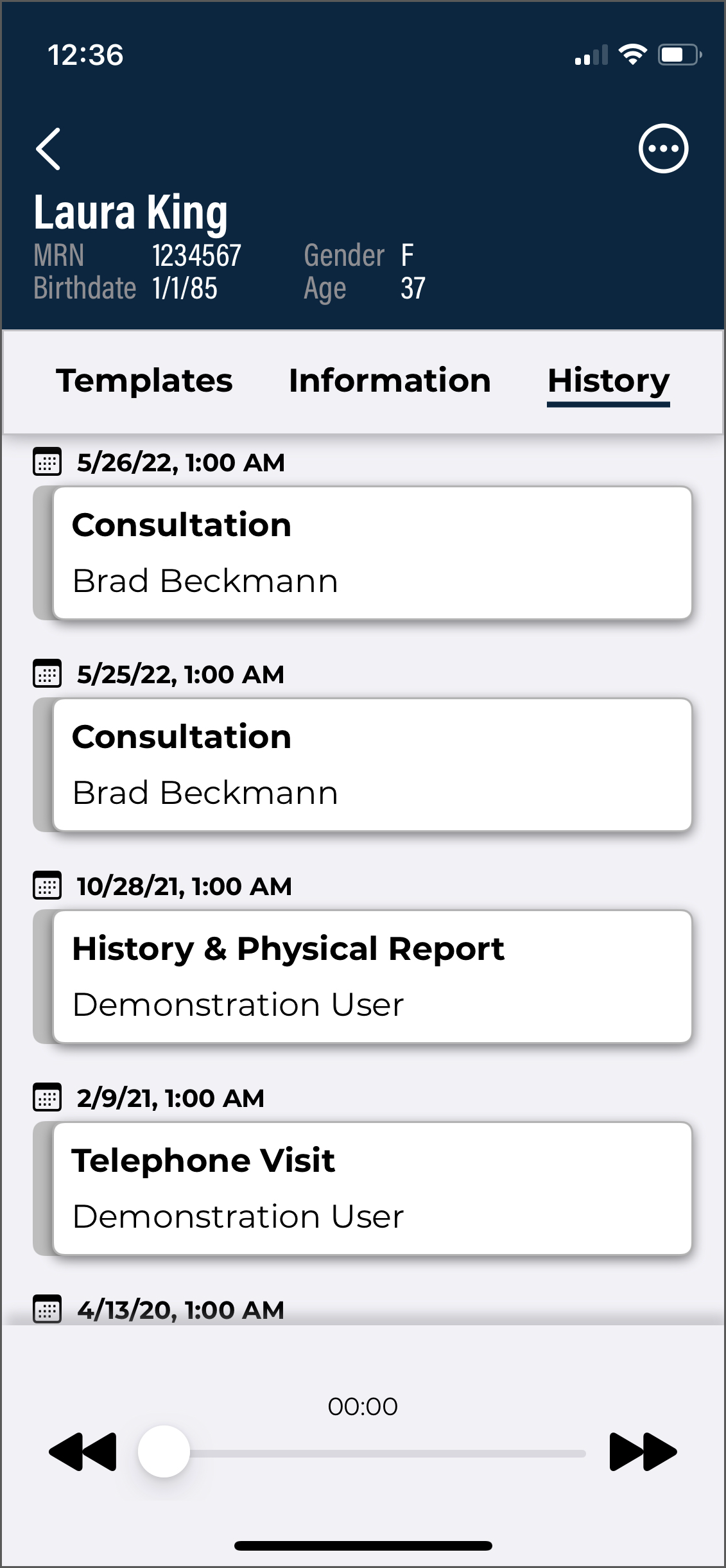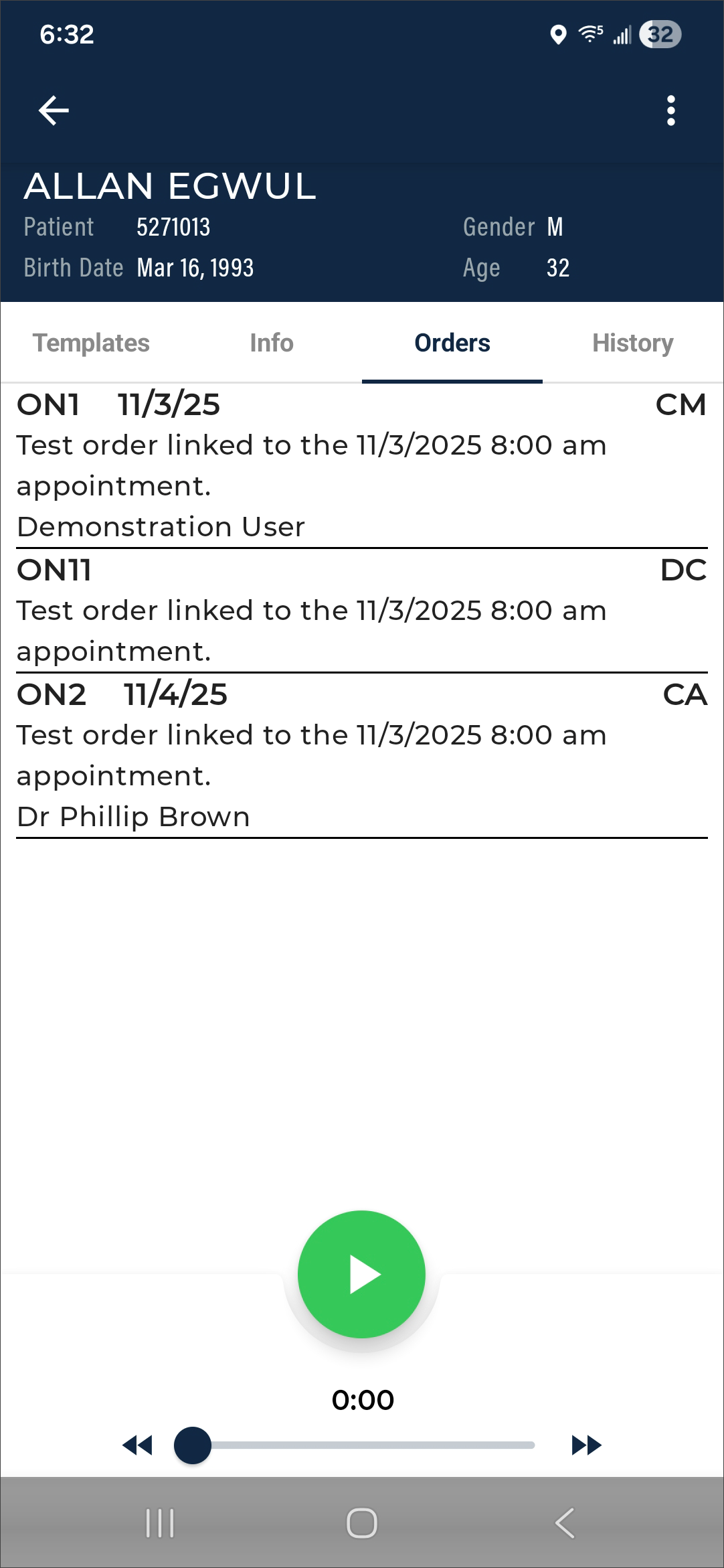 Dictation from another source - appointments with a dictation uploaded from a different mobile device or dictation source (InSync, InTouch, ShadowLink, etc.), or uploaded from this device but no longer stored on this device. Dictations uploaded from other devices or apps cannot be played from this device.