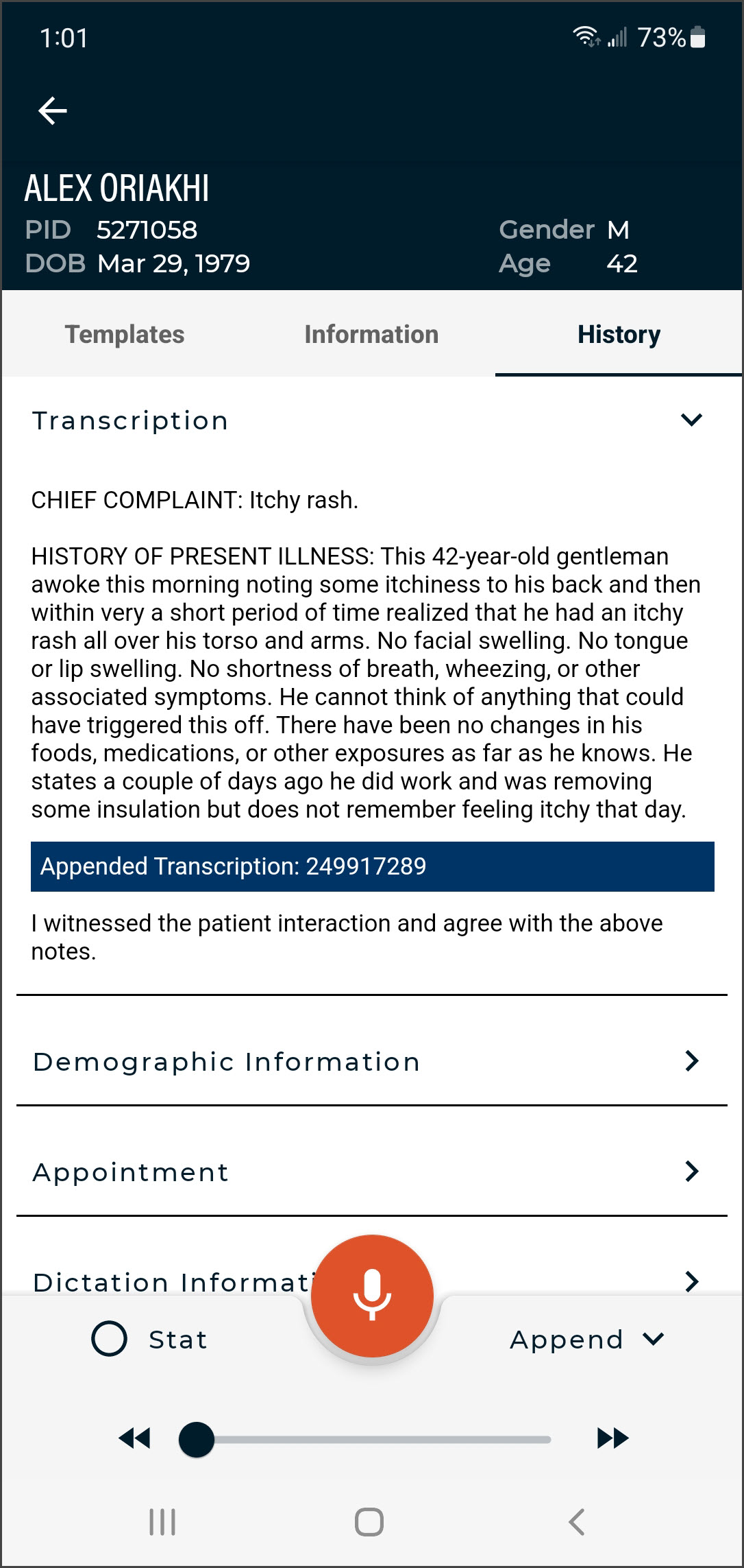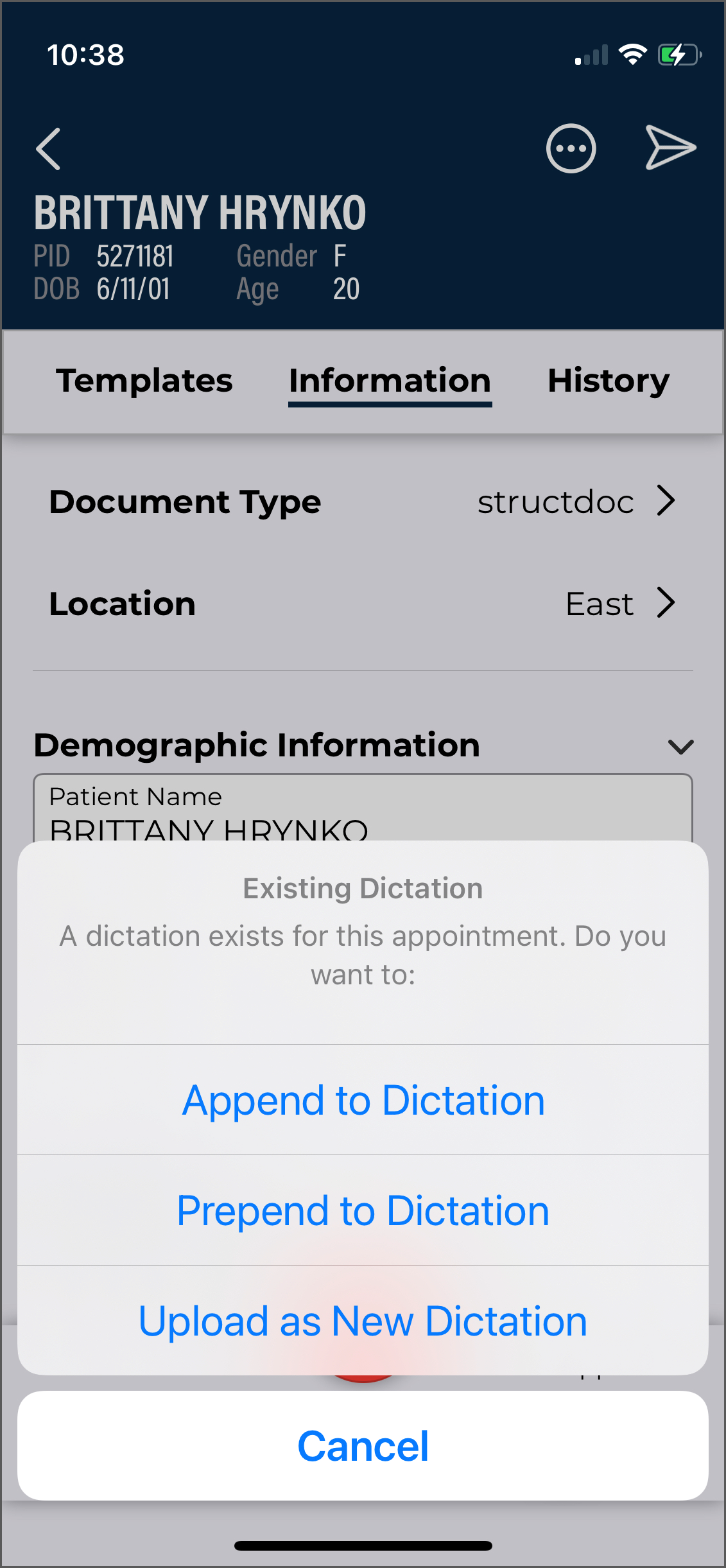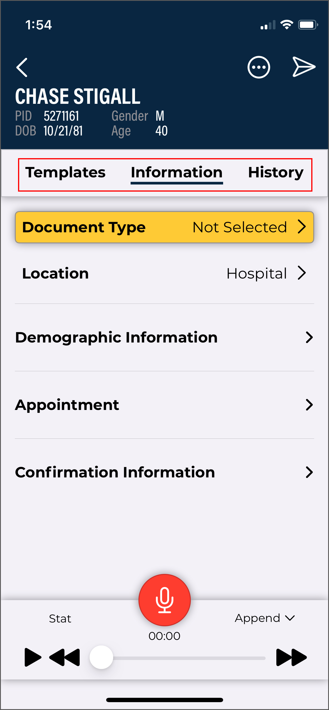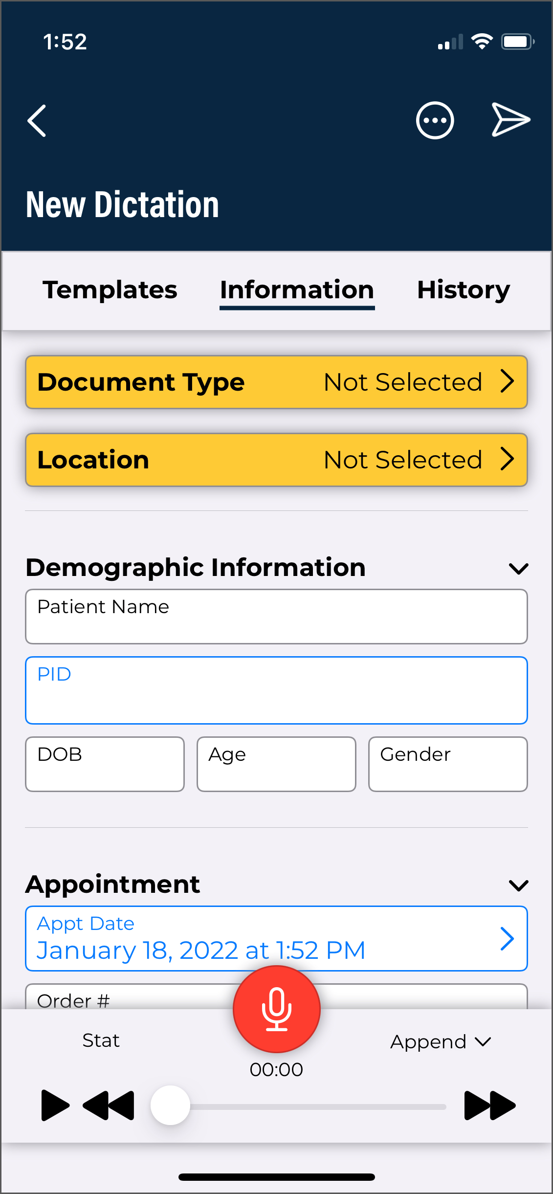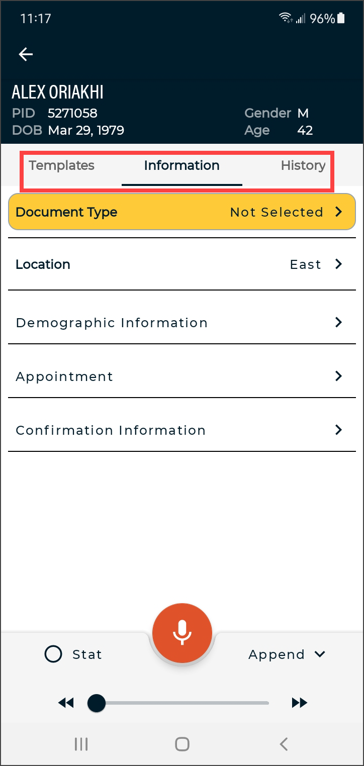 - Verify the correct Document Type and Dictator are selected in the demographics.