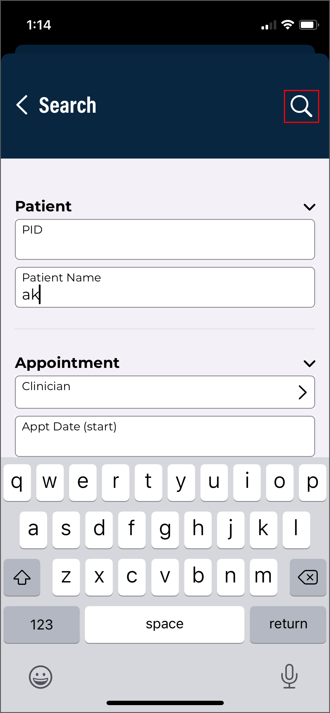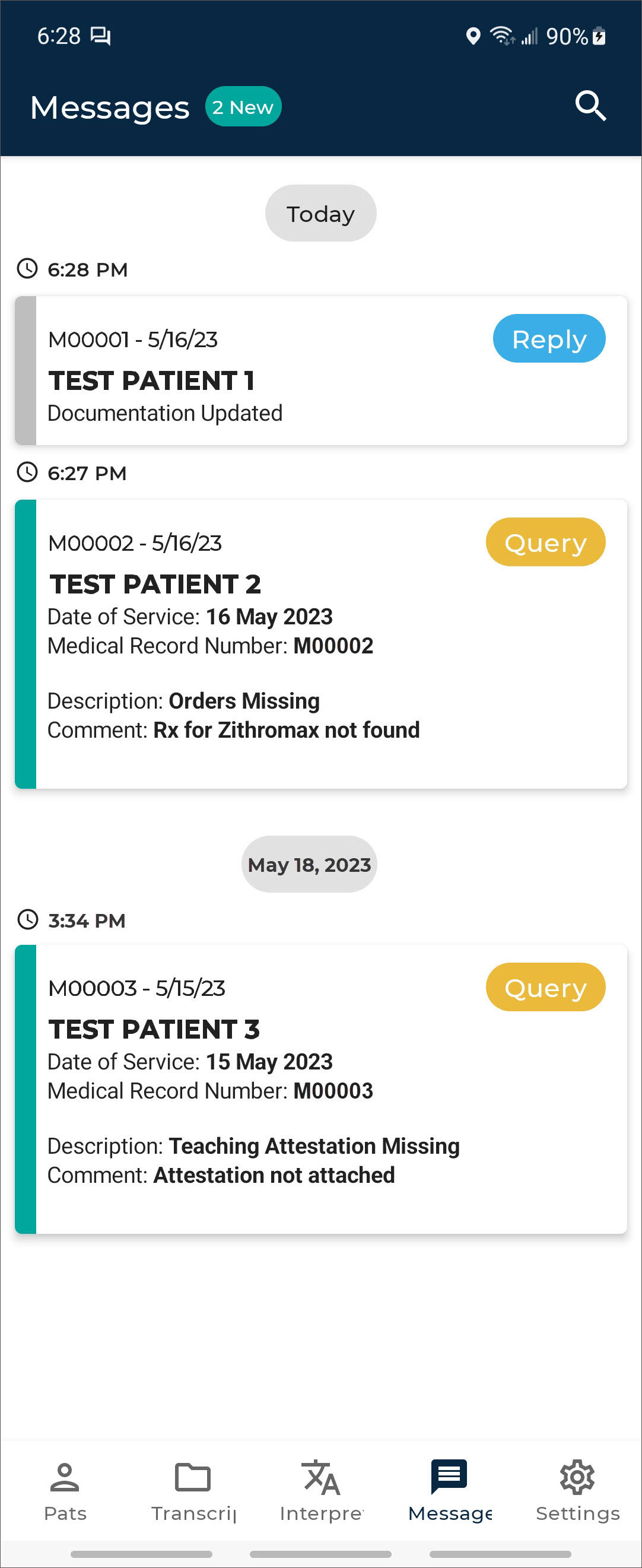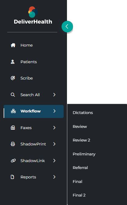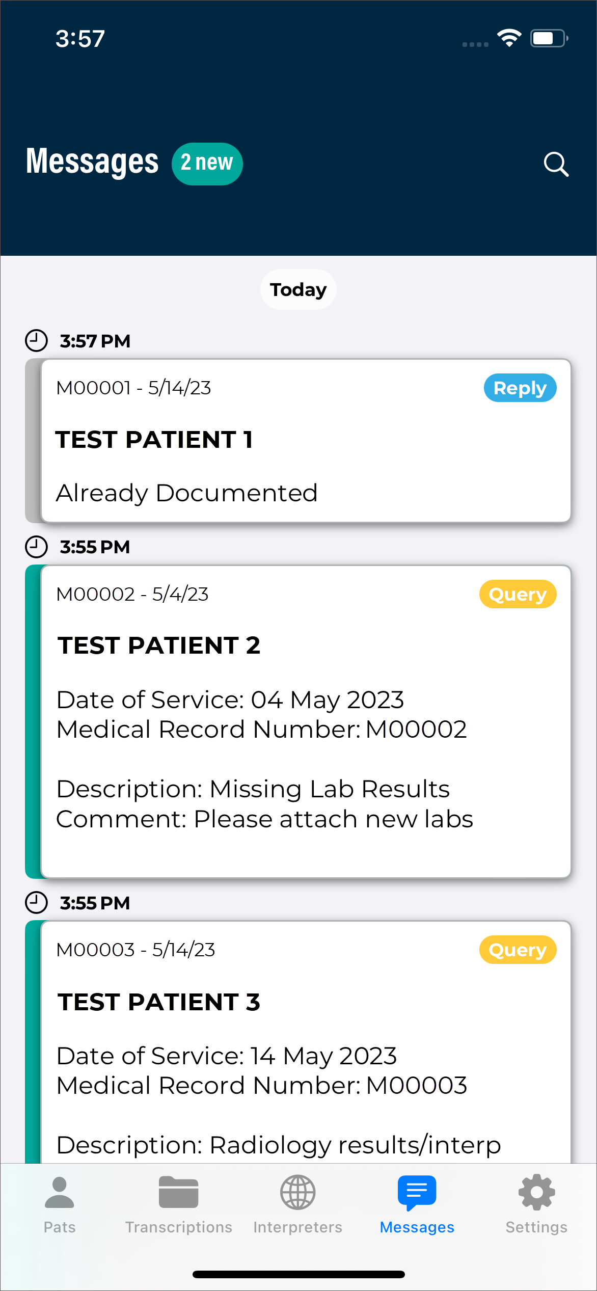 The patients tab opens the Patients screen, where users can record new dictations and view patient appointments (in an outpatient workflow) and/or inpatient encounters (in an inpatient workflow).
