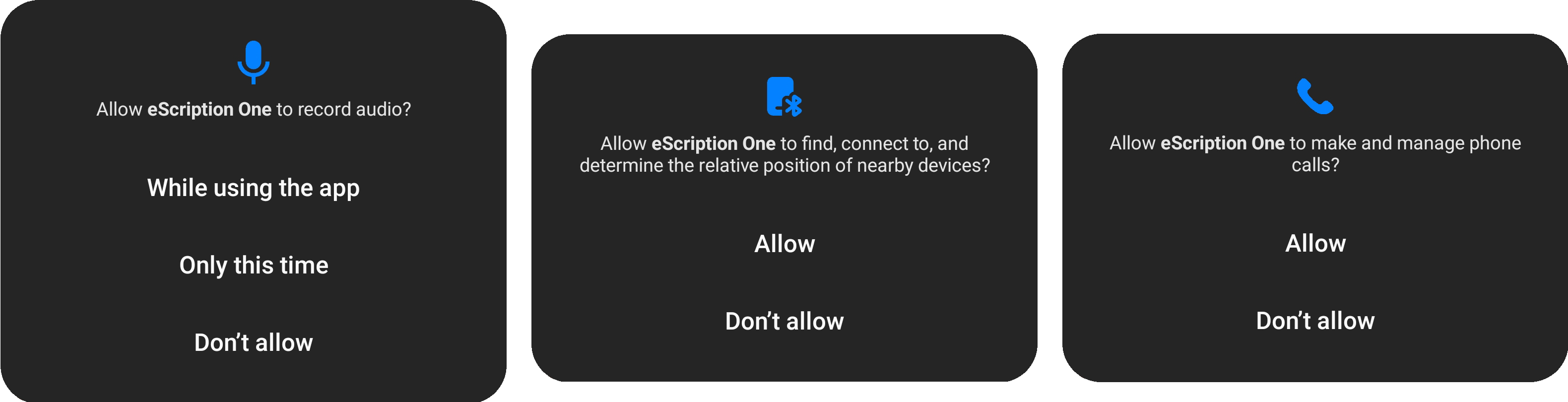 When entering the recording screen after the initial installation or reinstallation of the eSOne Mobile App, a request for permissions is presented. Permission to record audio, search for and connect to Bluetooth devices, and make and manage phone calls must be granted to enable recording controls.