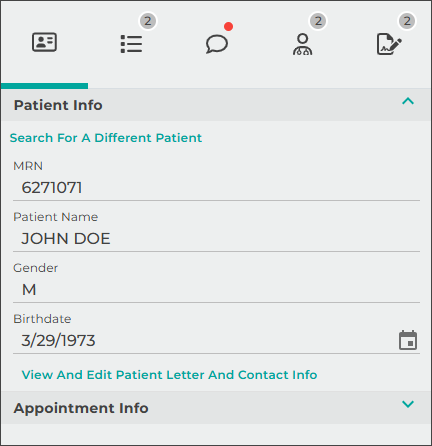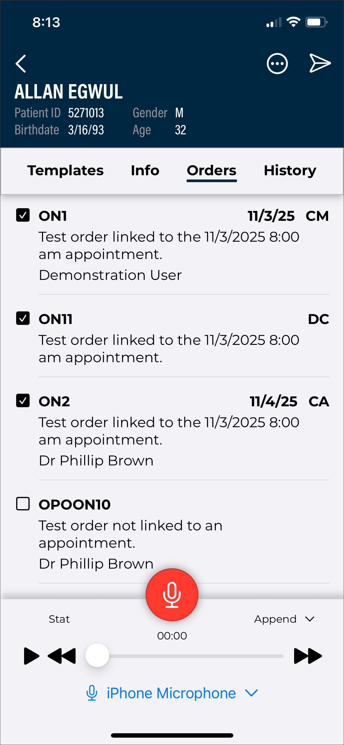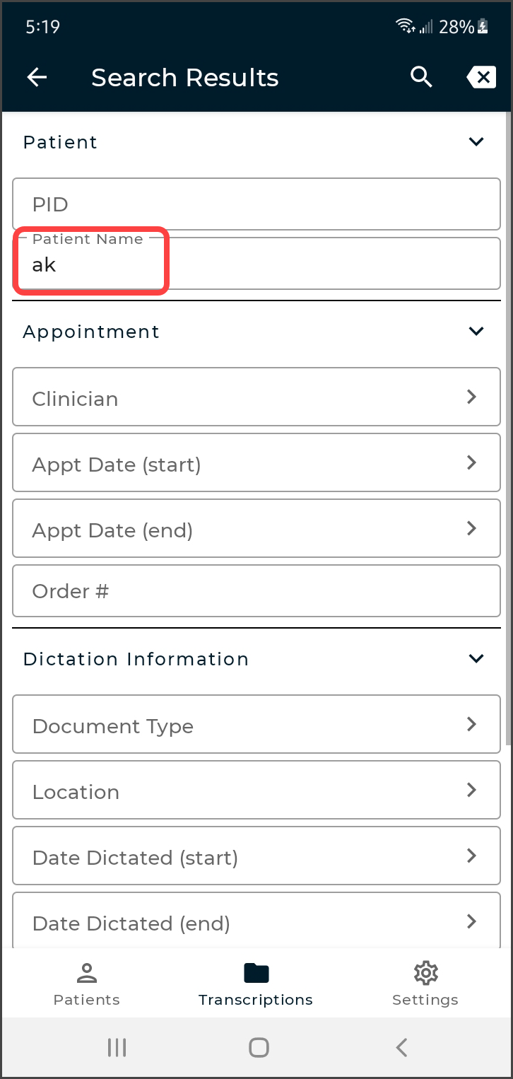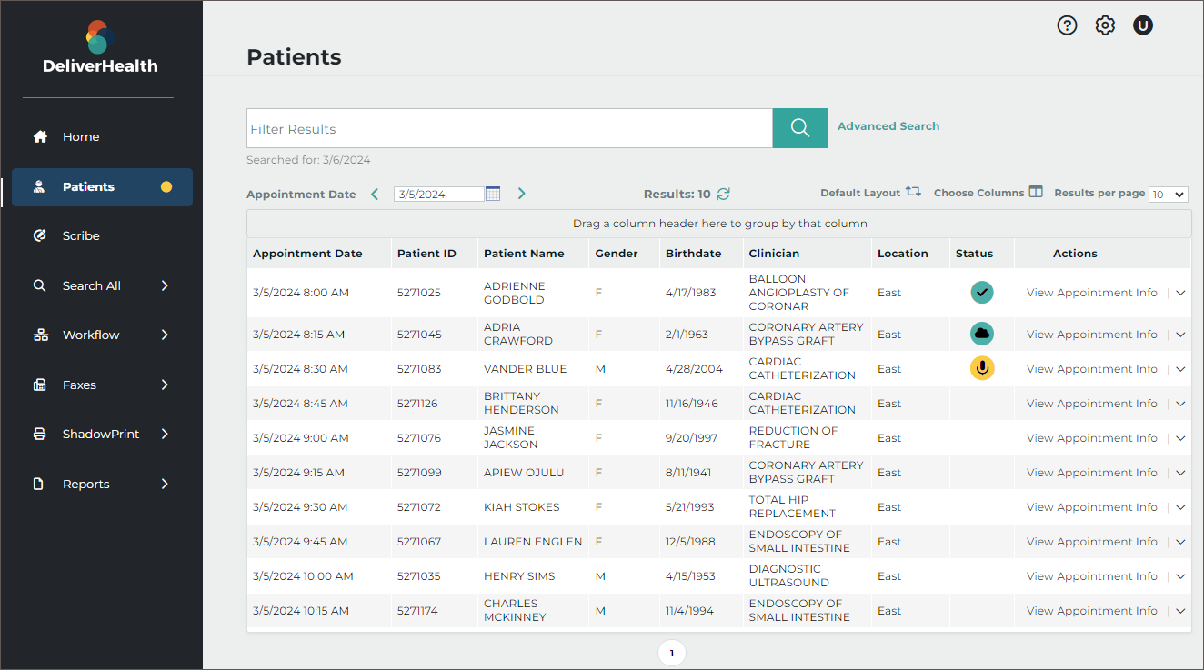 Use the Patients tab to view a list of patient appointments/encounters and create dictations.