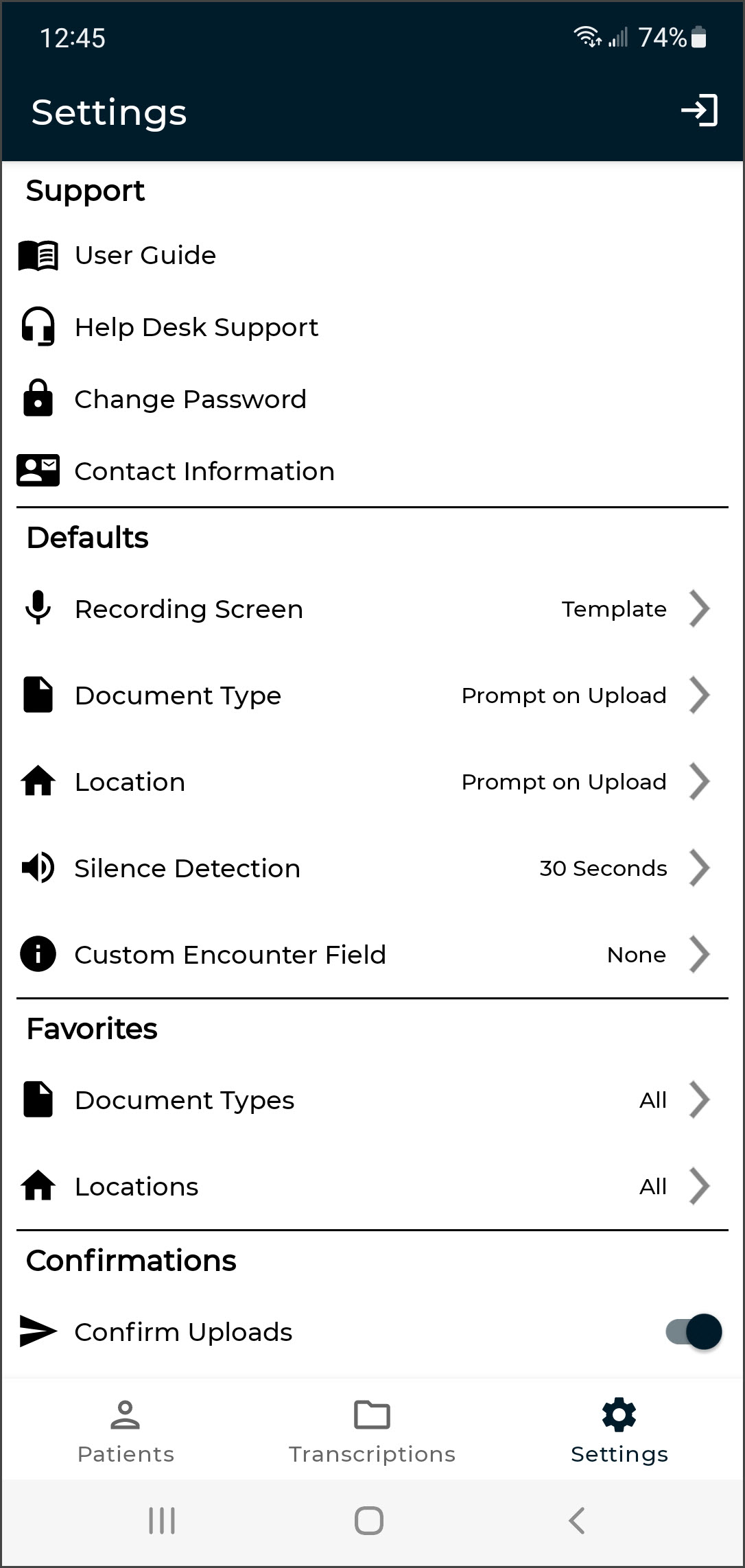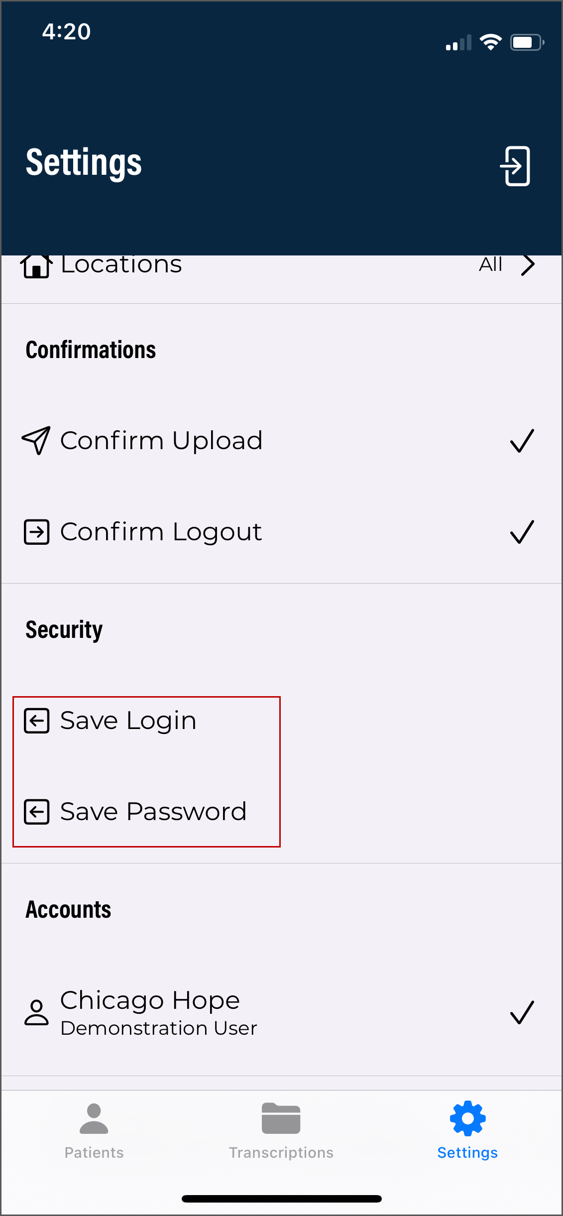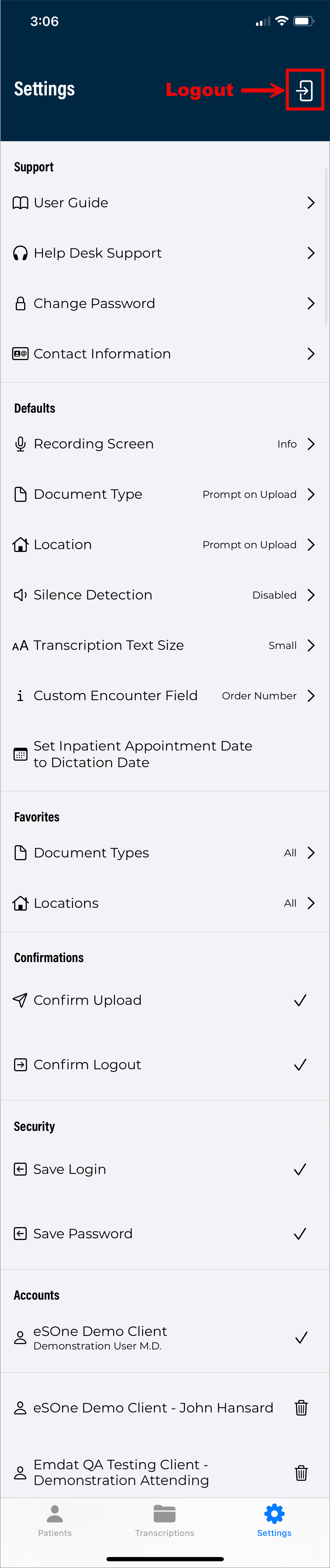 The Settings tab opens the Settings screen, where users can configure default settings for appointments, document types, locations, and other application features. Users can also add or switch to linked accounts from this tab, as well as log out of the mobile app.