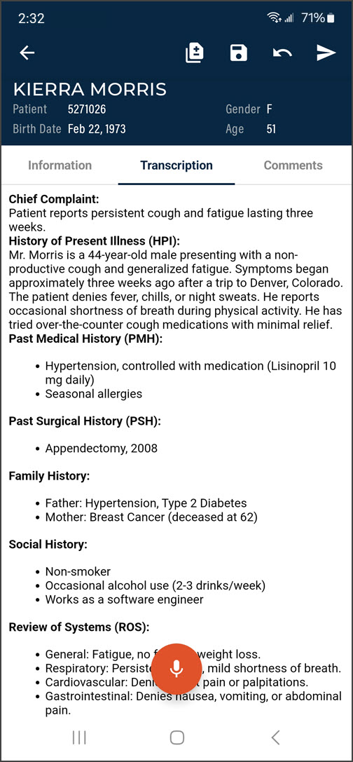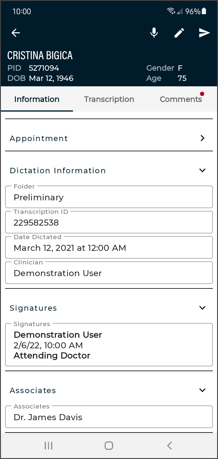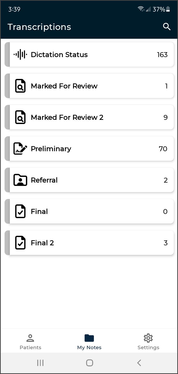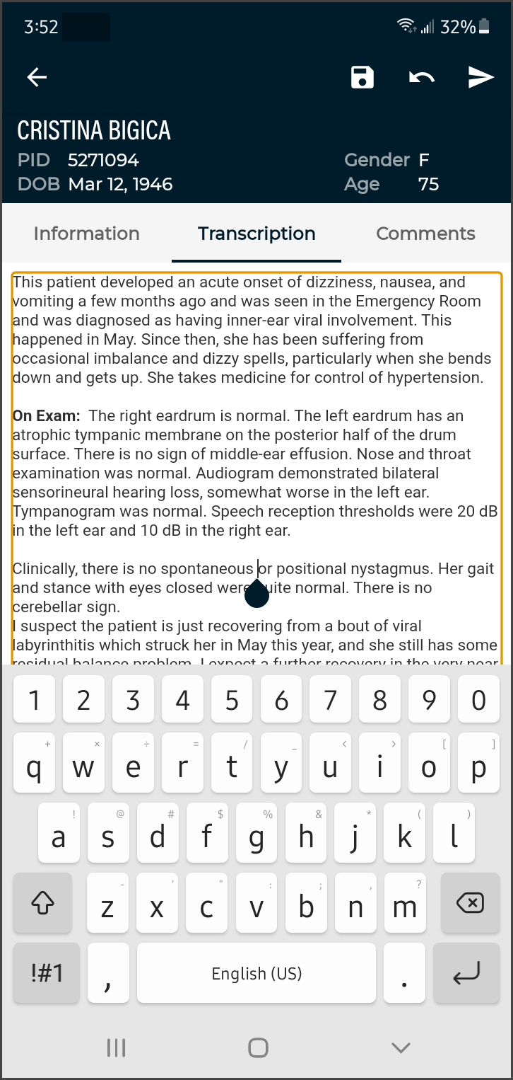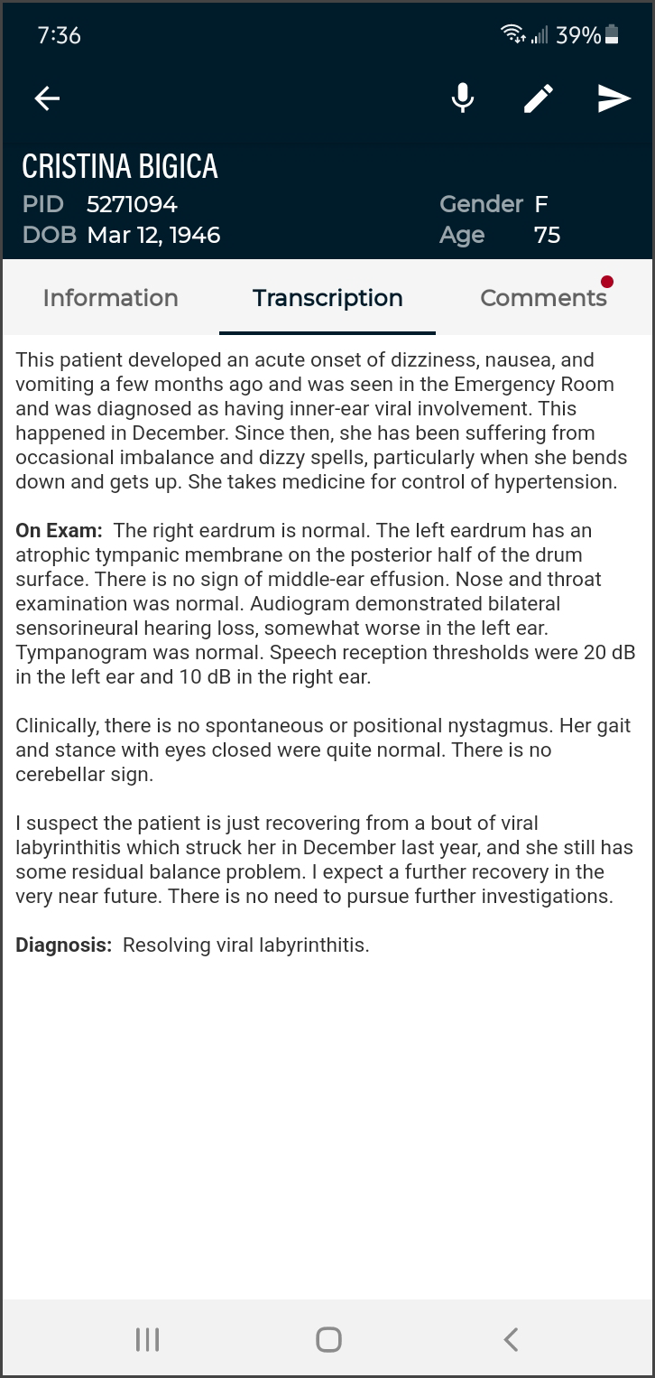 eSOne Mobile for Android offers a convenient, portable, end-to-end documentation process on any device running the Android operating system, such as tablets or phones. Clinicians can easily review, edit and complete documentation on their mobile device, as well as submit dictations for transcription. eSOne Mobile is a safe, secure application that supports HIPAA compliance.