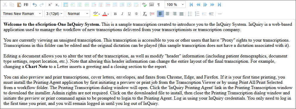 Reprocessing an InstaNote document in InScribe includes an additional enhancement not available in InQuiry. The speech-to-text (STT) draft can be edited to correct or add any parts of the dictation that were misinterpreted or omitted during the initial processing. With the updated STT draft, InstaNote will generate a more accurate and detailed note.