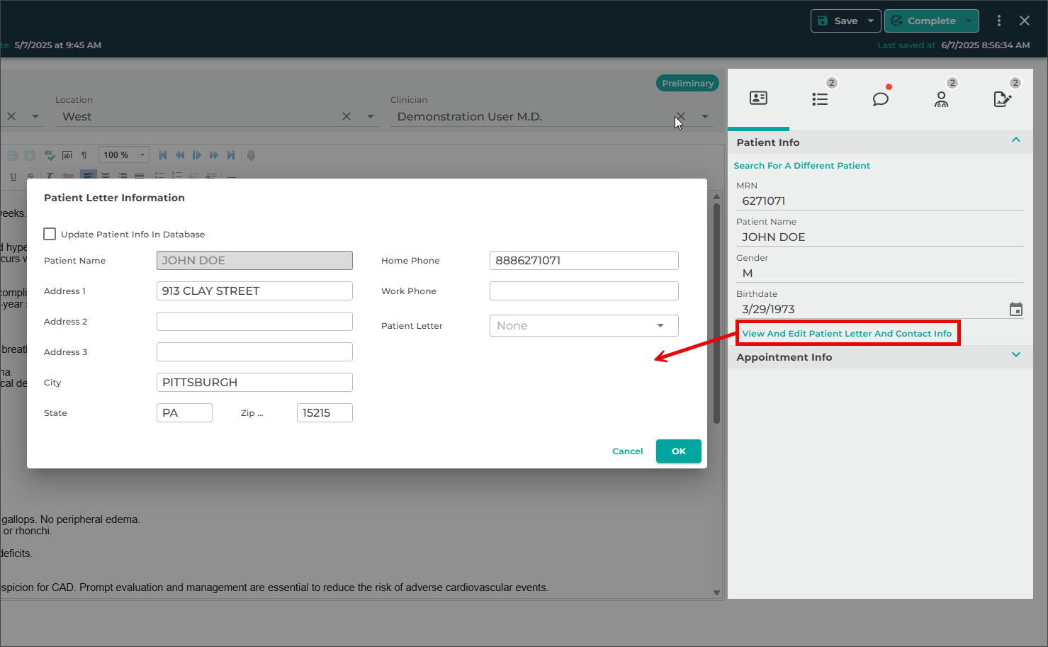 without saving changes. - Make any additional edits, such as updates to demographics, document type, location, or note text, as needed.
