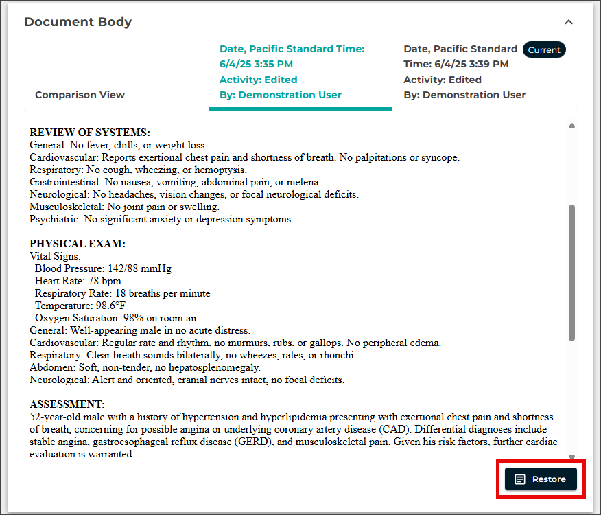- Click Diff to view a comparison of edits made to the note.