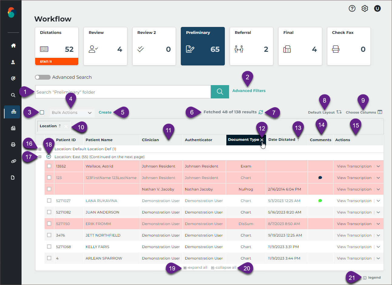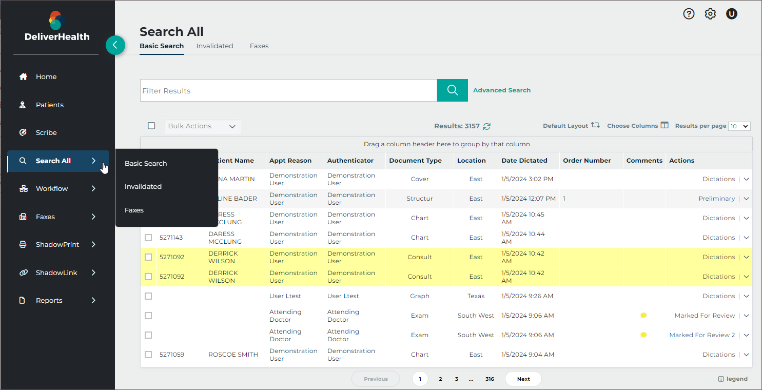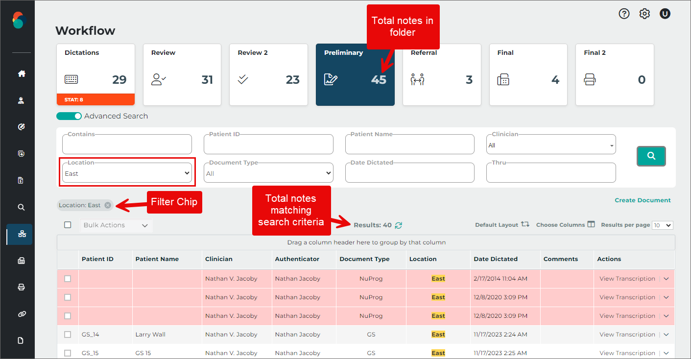 Users can minimize the number of appointments displayed on the schedule by filtering the list based on the dictation status. Statuses available for filtering are: